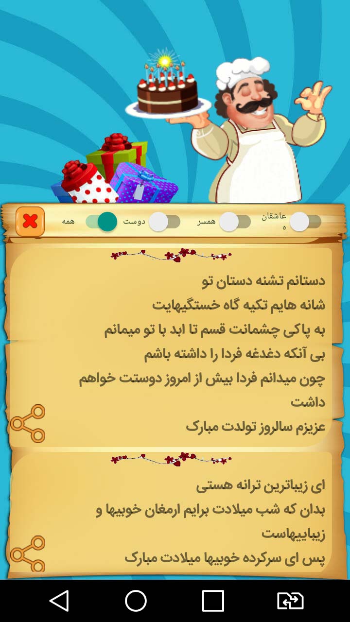 تولد نگار باباکرم ابزاری بسیار مفید است که کاربر می تواند با ثبت تاریخ تولد اعضا خانواده و فامیل یک روز قبل از تولد مطلع شود و پیام تبریک کارت نوشته و کیک نوشته ارسال کند.